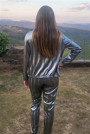 As peças metalizadas já carregam uma textura que chama atenção, mas elas combinam muito bem com as texturas de outros tecidos, tais como o jeans ou a renda com transparência.É uma peça para causar! Jaqueta metalizada com capuz, bolsos frontais, zíper na parte da frente e elástico nos punhos. Acabamento e costura no tom.