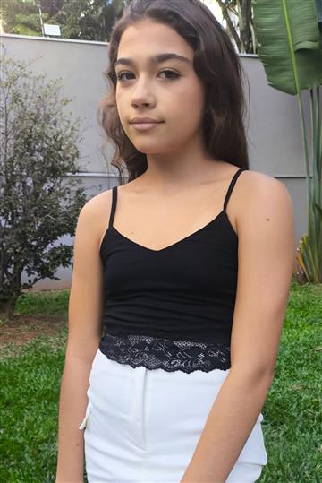Ter um cropped preto é algo imprescindível para montar looks inteligentes! Cropped preto de malha com renda e alças reguláveis