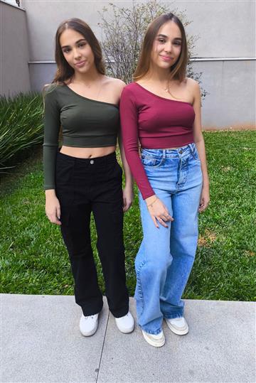 O cropped é uma peça que nunca sai de moda. Esta versão está super linda! Cropped com bojo, um ombro só de malha canelada.