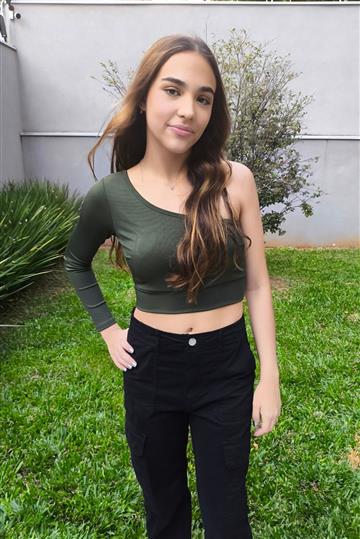 O cropped é uma peça que nunca sai de moda. Esta versão está super linda! Cropped com bojo, um ombro só de malha canelada.