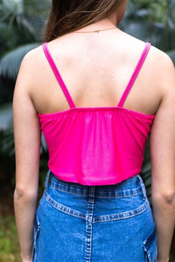 Cropped de alça com bojo e detalhe em V na frente Acabamento e costura no tom