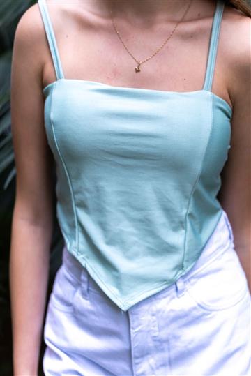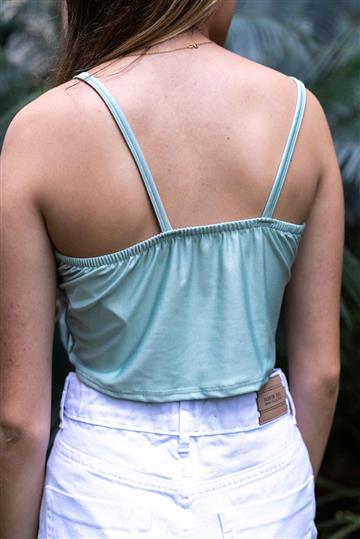 Cropped de alça com bojo e detalhe em V na frente Acabamento e costura no tom