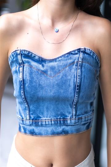 Se você quer deixar seu look lindo pode apostar nesta peça! Cropped jeans tomara que caia com zíper e elástico nas costas Possui elastano