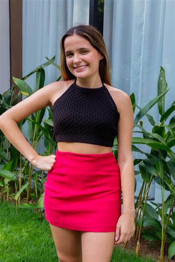 Os croppeds de tricot estão super em alta no verão! Pode apostar! Cropped de tricot preto frente única com leves desenhos em relevo