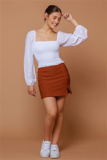 Pensa em uma peça básica mas que fica linda e é essa! Bata de lastex e manga de tecido com decote quadrado