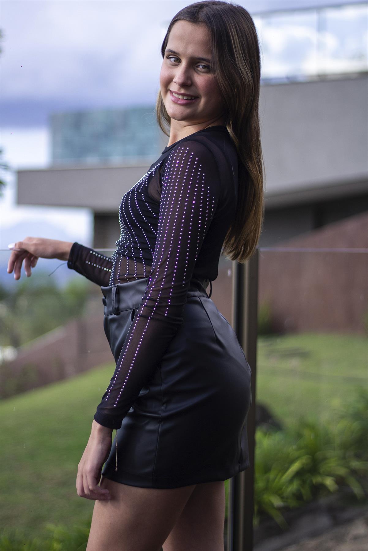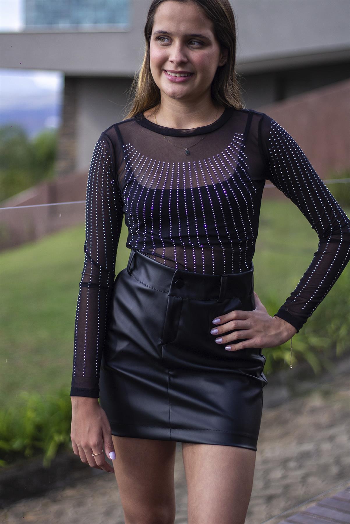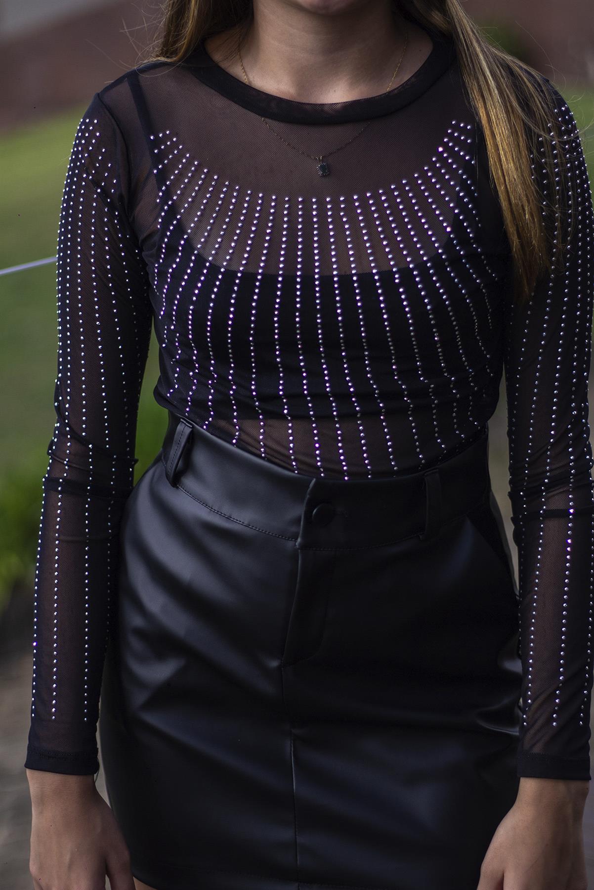 O visual fashionista fica por conta do uso do body com um elemento mais! A peça com brilho também chama a atenção para o rosto, valorizando suas feições. Body preto segunda pele com strass na parte da frente e nas mangas. Decote redondo e acabamento e costura no tom.