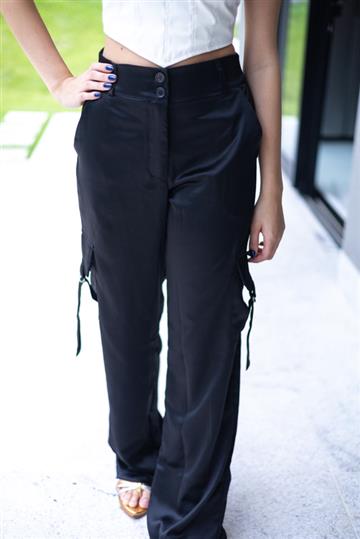 Você sabe a diferença entre calça cargo e jogger? Apesar de parecidas o que diferencia a calça cargo é a quantidade de bolsos. Calça cargo de cetim preta com dois bolsos frontais e dois bolsos laterais. Acabamento e costura no tom.