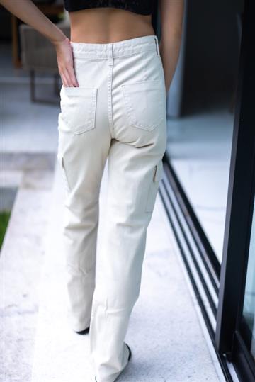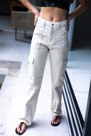 A calça cargo é um modelo mais solto, com bolsos nas laterais. Essa peça foi tendência nos anos 2000, e hoje, volta para o streetwear de 2023. Com inspiração militar e muito conforto, a peça foi conquistando adeptos graças à sua versatilidade e conforto. Calça cargo de brim bege com bolsos laterais e traseiros.