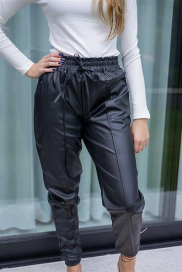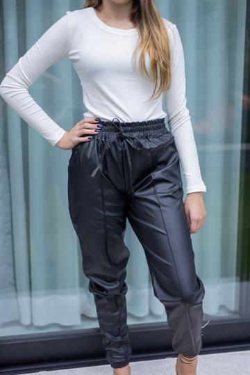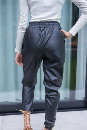 Sabe aquela calça que combina com tudo? É essa! Tecido confortável e mega estilosa. Calça jogger de couro fake, cintura alta, cós com elástico, elástico nas barras, detalhe na amarração, bolsos frontais, acabamento e costura no tom.