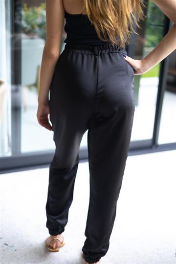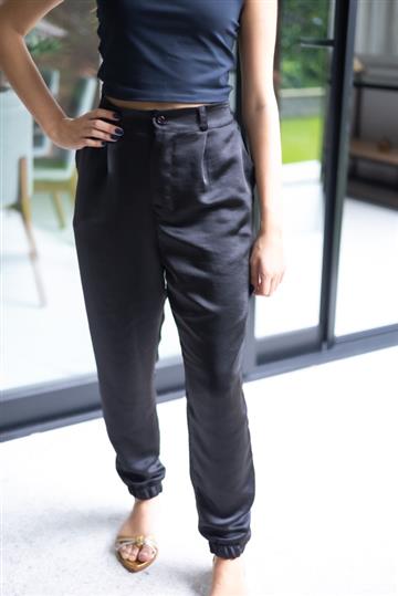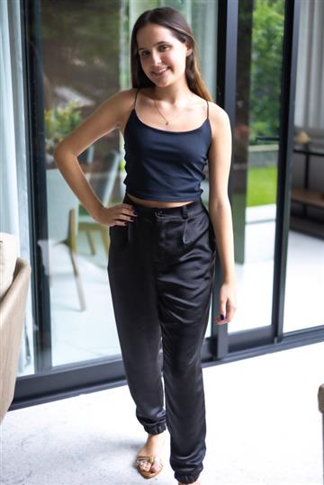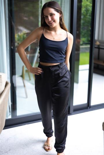 Ter uma calça preta no estilo "social" faz qualquer look ficar mais elegante! Basta saber combinar a blusa e os acessórios. Calça de cetim preta com dois bolsos frontais, elástico na barra e leve elástico na cintura. Acabamento e costura no tom.