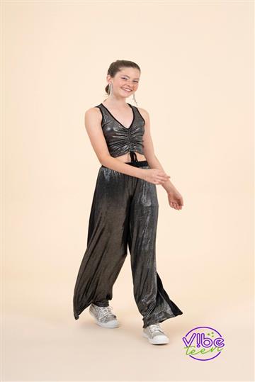 Comprar um conjunto é uma aposta sempre certa pois permite uma versatilidade única! Você pode também usar as peças separadamente criando sempre novos looks! Conjunto metalizado com cropped com franzido na parte da frente Calça estilo pantalona com elástico na cintura