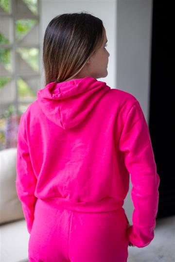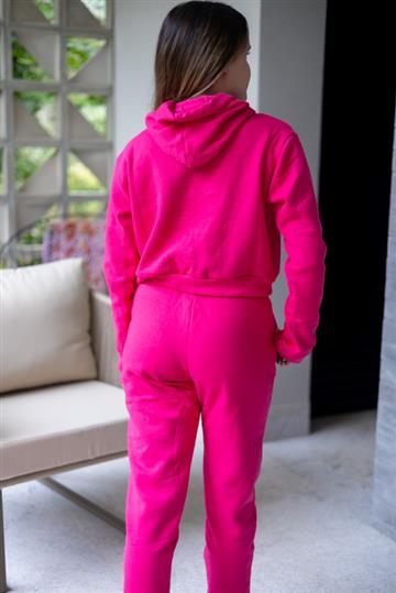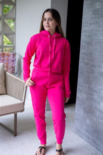 Blusa com capuz e elástico nos punhos Calça com dois bolsos frontais, elástico na cintura e na barra