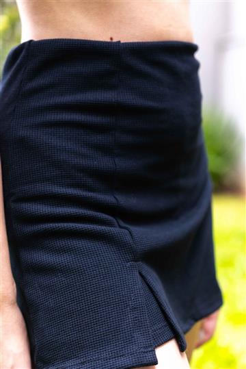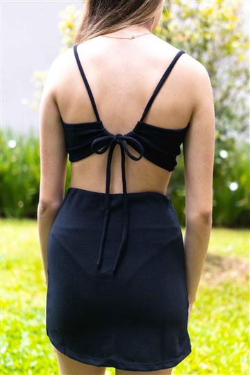 Conjunto em malha com cropped de amarração e bojo Saia short com elástico na cintura e leve fenda na frente