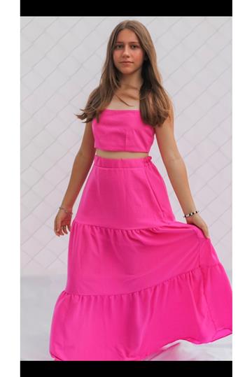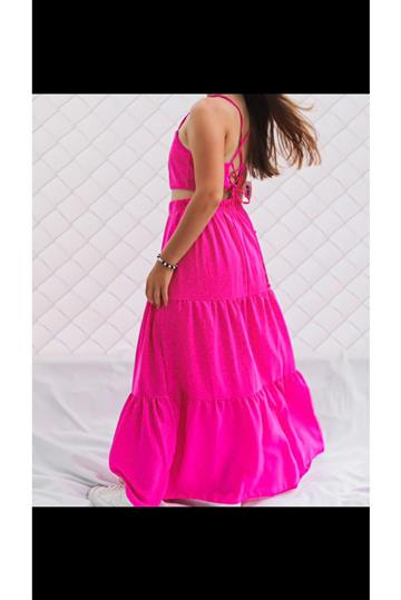 Conjunto cropped rosa sem bojo e saia longa . O cropped possui amarração nas costas. Conjunto não possui estampas.
