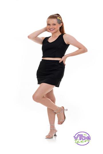 Um conjunto saia e cropped é uma das combinações mais queridinhas das meninas, principalmente durante as estações mais quentes No inverno é só jogar um casaco e arrasar! Conjunto de saia curta com elástico na cintura e cropped com decote redondo Acabamento e costura no tom