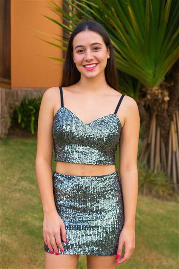 Prepare-se para brilhar muito nas mais badaladas e também no dia a dia com looks de paetês. É uma super tendência que veio para ficar. Conjunto de paête prata com cropped e saia. Cropped com paête na parte frontal, helanca nas costas e manga transparente. Possui bojo.