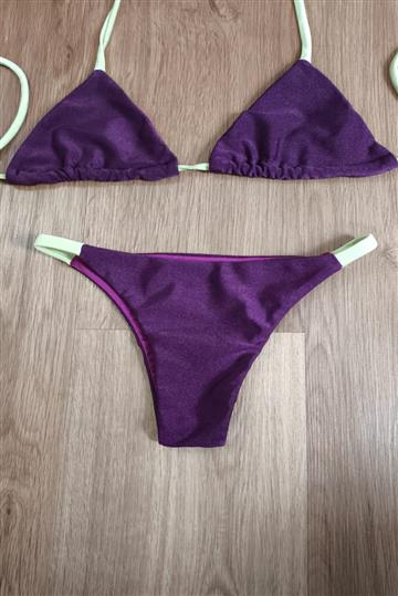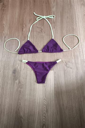 Para ficar linda em qualquer foto use este biquini! Modela o corpo e é um arraso! Biquíni roxo com alças verdes, modelo cortininha, confeccionado em tecido poliamida e elastano. Lycra canelada. Possui fechamento por tiras para amarração no pescoço e nas costas, calcinha de tira,acabamento e costura no tom.