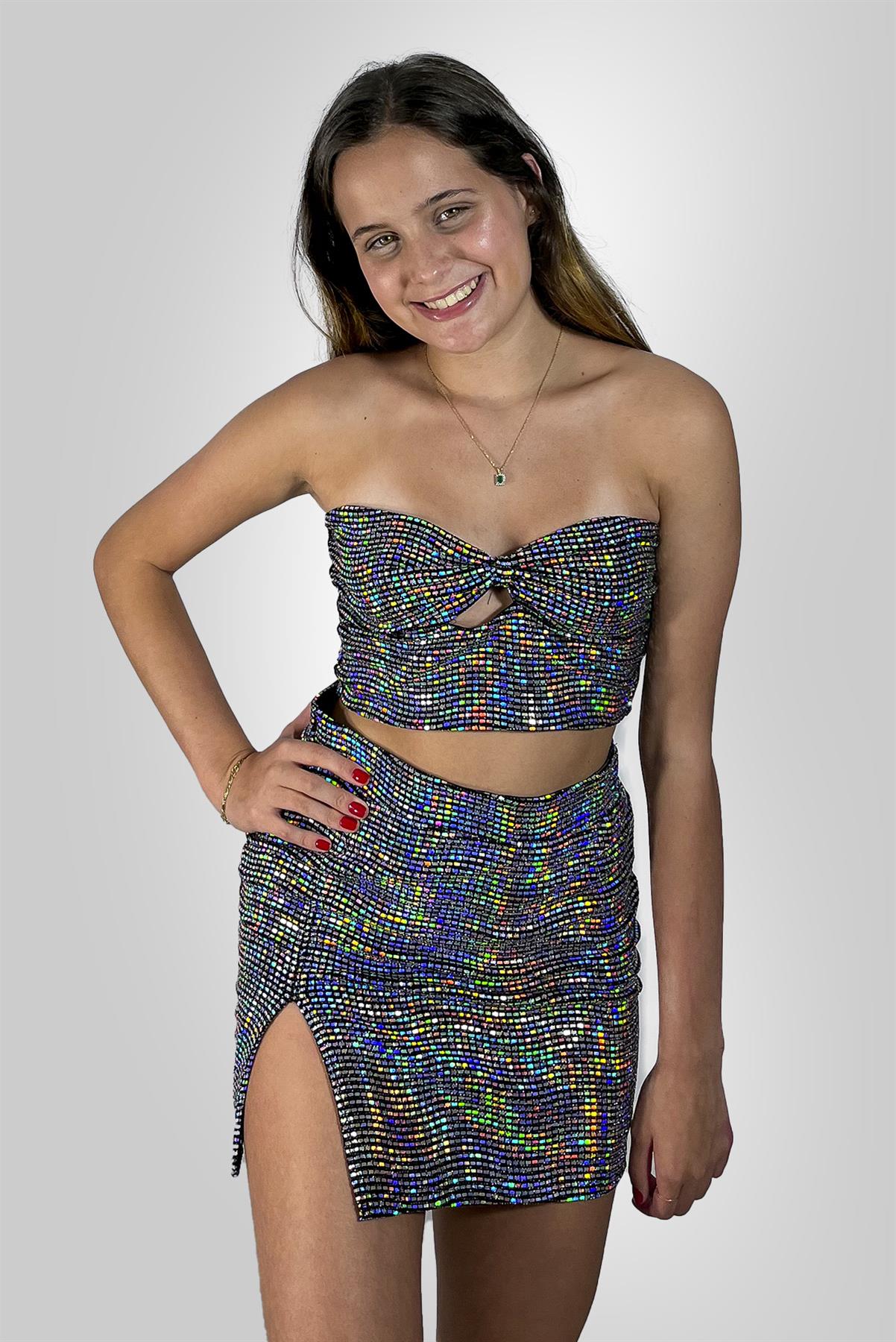 Você sabia que a minissaia foi mais do que o encurtamento do tecido, representou liberdade às mulheres da época. O modelo se popularizou entre 1965 e 1970, na mesma época do auge dos Beatles. Quando foi lançada, ela foi considerada ousada, mas com o tempo as mulheres mais jovens a adotaram como peça básica! Minissaia de brilho com cintura alta, elástico na cintura, fenda na parte frontal e zíper na parte de trás Possui forro Acabamento e costura no tom