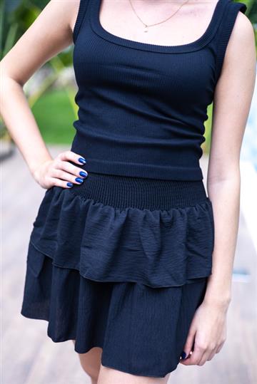 Esta saia é uma peça coringa para qualquer estação do ano! Linda e versátil de ser usada! Saia de crepe com lastex na cintura, duas camadas de babado e forro. Acabamento e costura no tom.