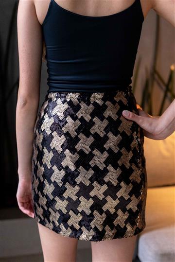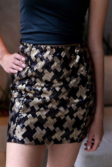 O paête veio para ficar e deixa a peça muito mais sofisticada! Saia em paête preto e dourado, elástico na cintura, zíper lateral e forro
