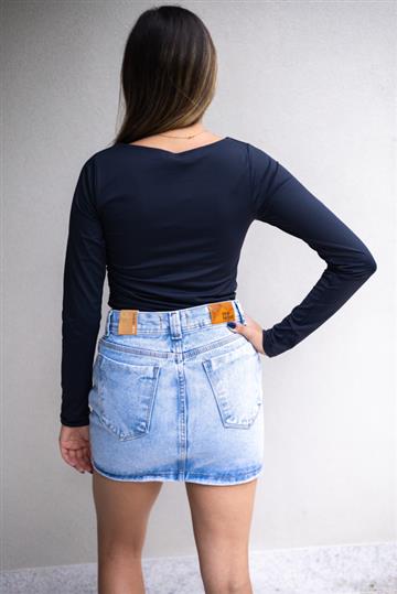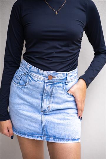 O jeans sempre permite muitas combinações Desde as mais casuais até algumas composições mais ousadas! Mini saia jeans com dois bolsos frontais e dois bolsos traseiros