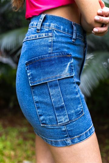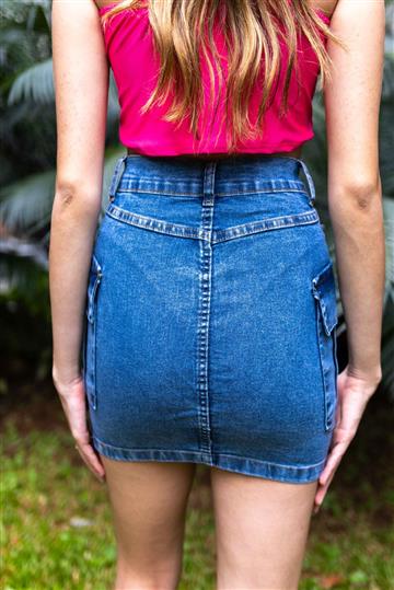 Saia jeans cargo, com dois bolsos laterais e elastano Botão e zíper frontal