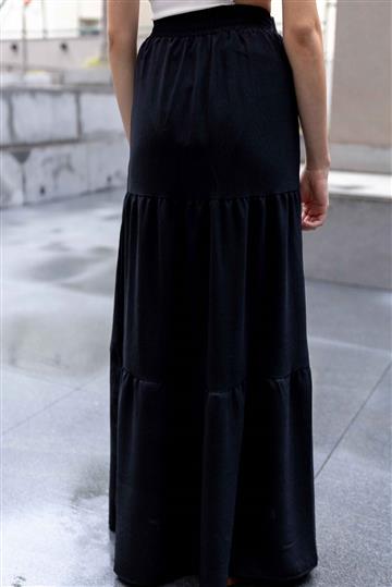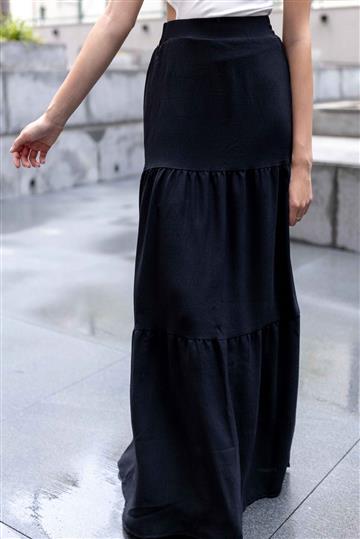Saia longa de tecido, com elástico na cintura, babados e forro