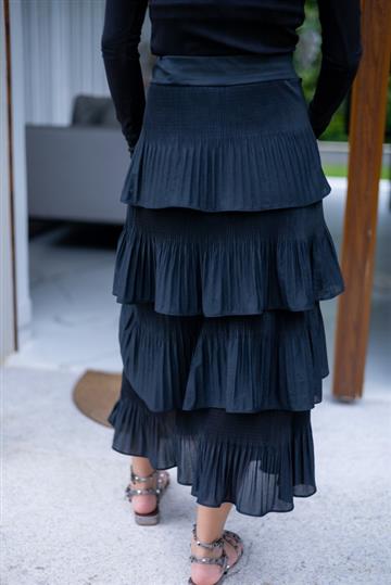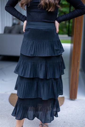 Vestir esta saia é estar pronta para arrasar! Super estilosa para usar casualmente ou em baladas. Saia preta com babado, elástico na cintura e forro. Acabamento e costura no tom.