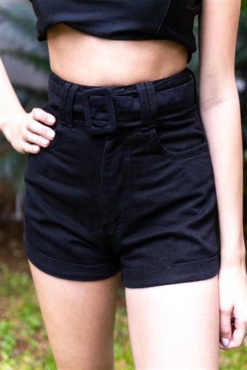 Short de brim preto com dobras nas barras, com cinto de brim, dois bolsos frontais e dois bolsos traseiros Acabamento e costura no tom