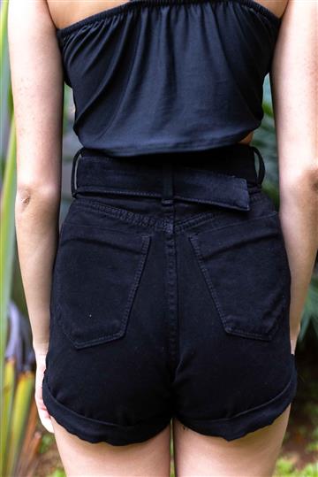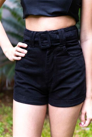 Short de brim preto com dobras nas barras, com cinto de brim, dois bolsos frontais e dois bolsos traseiros Acabamento e costura no tom