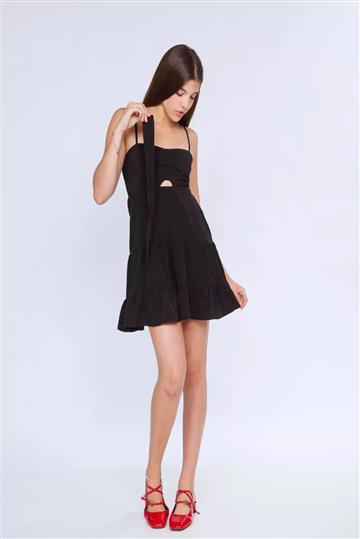 Vestido de tecido com micro poá, laço frontal, alças reguláveis, lastex nas costas e saia com babado